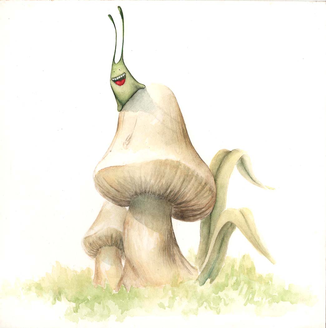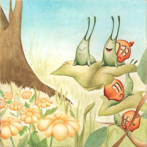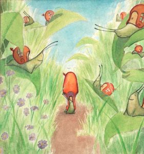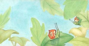 Pero el caracol presumido, por su tamaño, era el único que no podía subir a lo alto de las hojas y siempre se quedaba abajo.