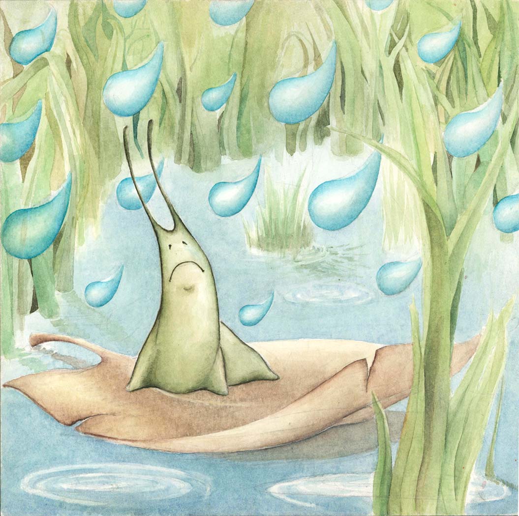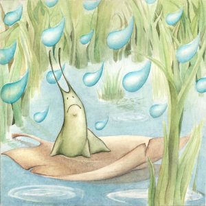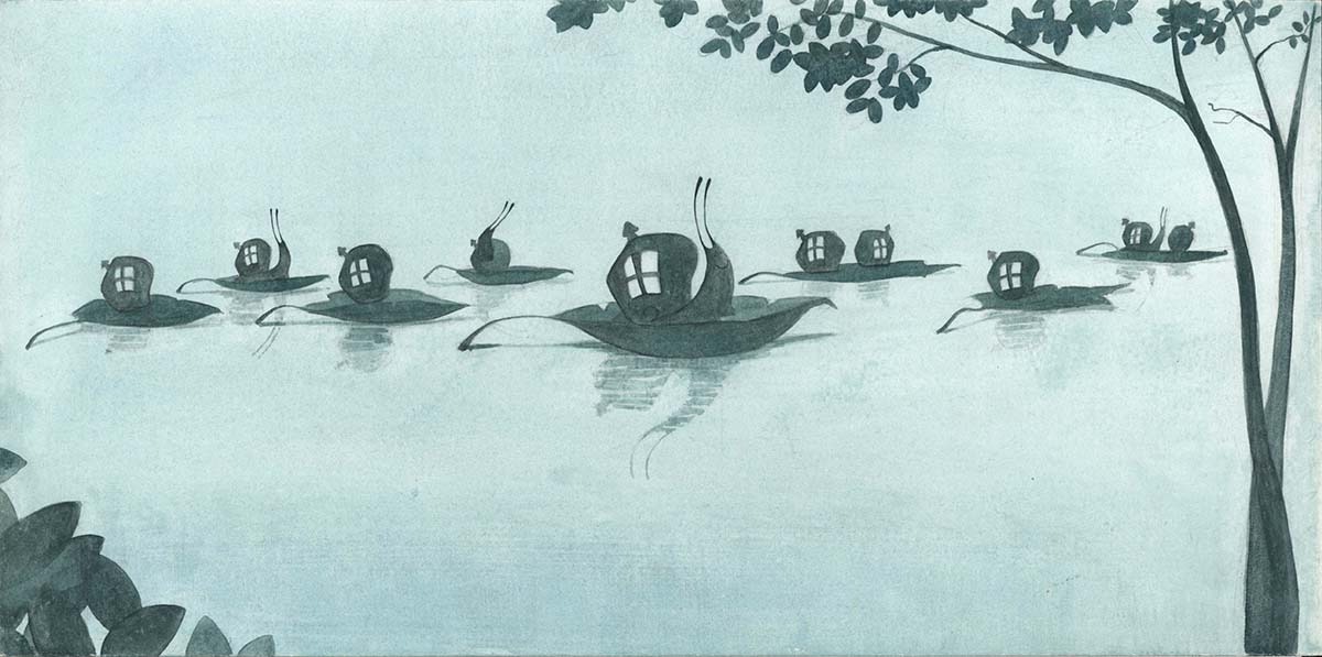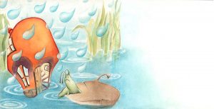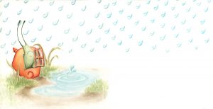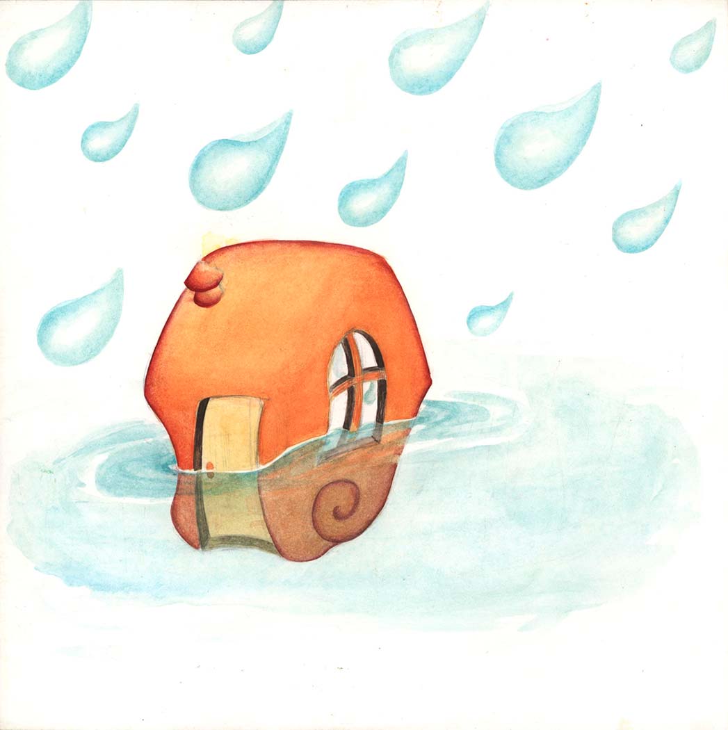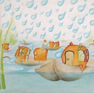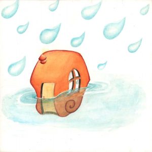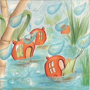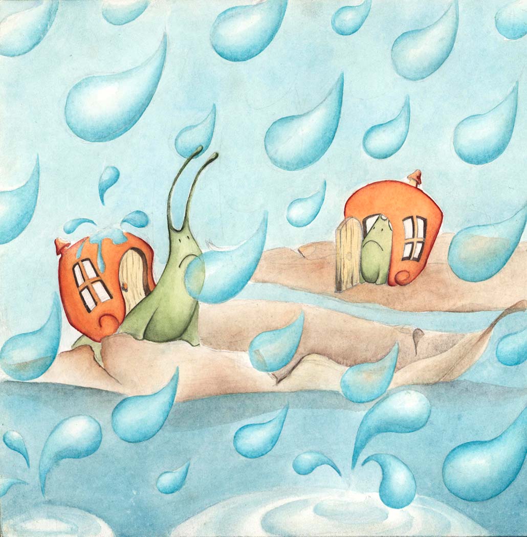 Pronto, se formó un enorme charco en el suelo, había agua por todas partes. Los caracoles se dieron cuenta de que estaban en peligro y se encerraron en sus casitas, pero el agua comenzó a entrar en ellas.