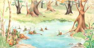 Al llegar a una orilla se pusieron muy alegres y desembarcaron. Se pusieron en marcha para conocer el nuevo lugar y comenzaron a buscar hojas para comer y lugares agradables por donde pasear.