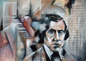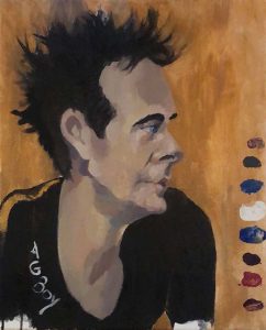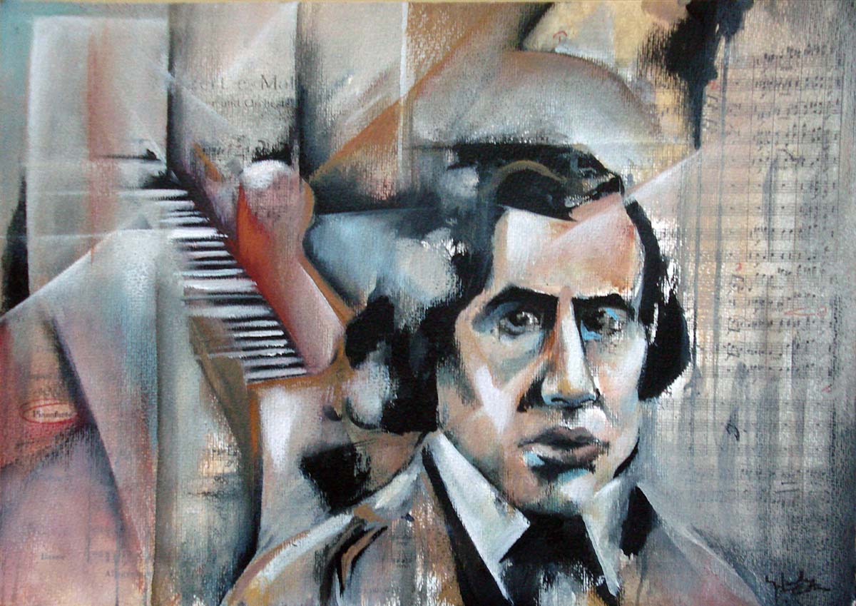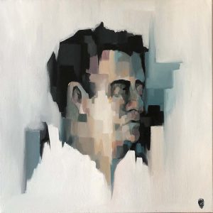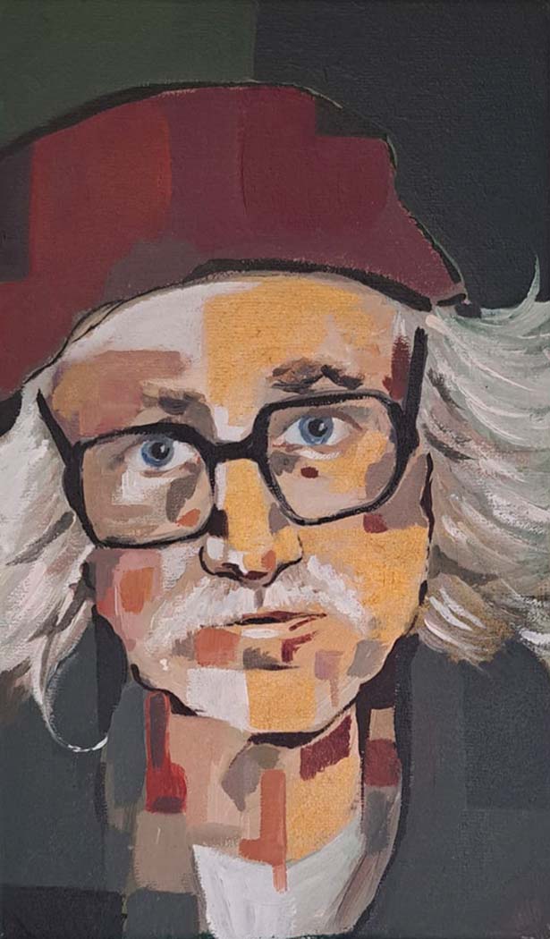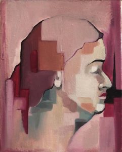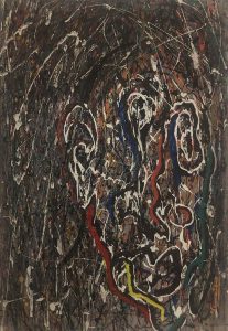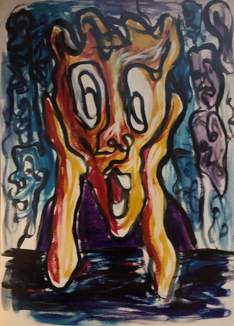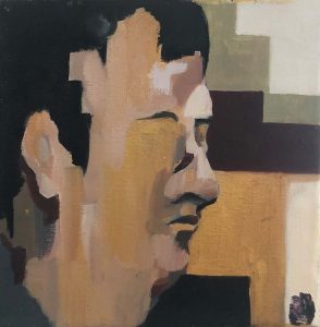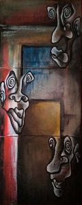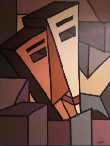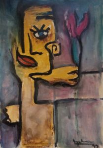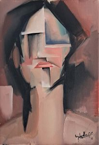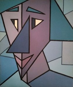 Recuerdo que después de bocetos para representar un rostro cualquiera. Con técnica acrílica decidí usar las líneas rectas y ángulos divisorios como planos para configurarlo. Ahora veo, que tenía buen pulso, ya que las líneas estaban hechas con pincel y sin ayuda de cinta adhesiva. Mi rostro “Niña en Violeta”, y el “Hombre de la Ciudad”, de más dimensiones… serían los primeros. Luego me propuso, si no recuerdo mal, que experimentara, y Calvet, como lo llamaba puso el título de “Entre Pollock y Picasso”. Yo no los conocía bien como tal, pero tanto por técnica elegida como por la figura del rostro que se puede apreciar, sí se parece algo al rostro de Picasso.